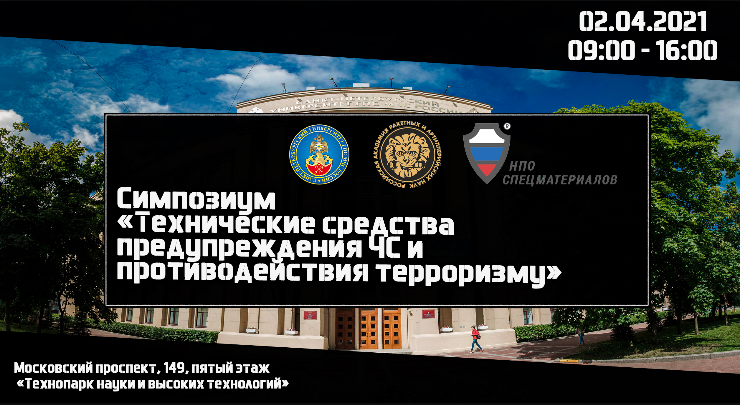 ФГБОУ ВО «Санкт-Петербургский университет ГПС МЧС России», АО «НПО Спецматериалов», ФГБУ «Российская академия ракетных и артиллерийских наук» 2 апреля 2021 г. в рамках XXIV Всероссийской научно-практической конференции «Актуальные проблемы защиты и безопасности», проводит симпозиум по направлению «Технические средства предупреждения ЧС и противодействия терроризму».