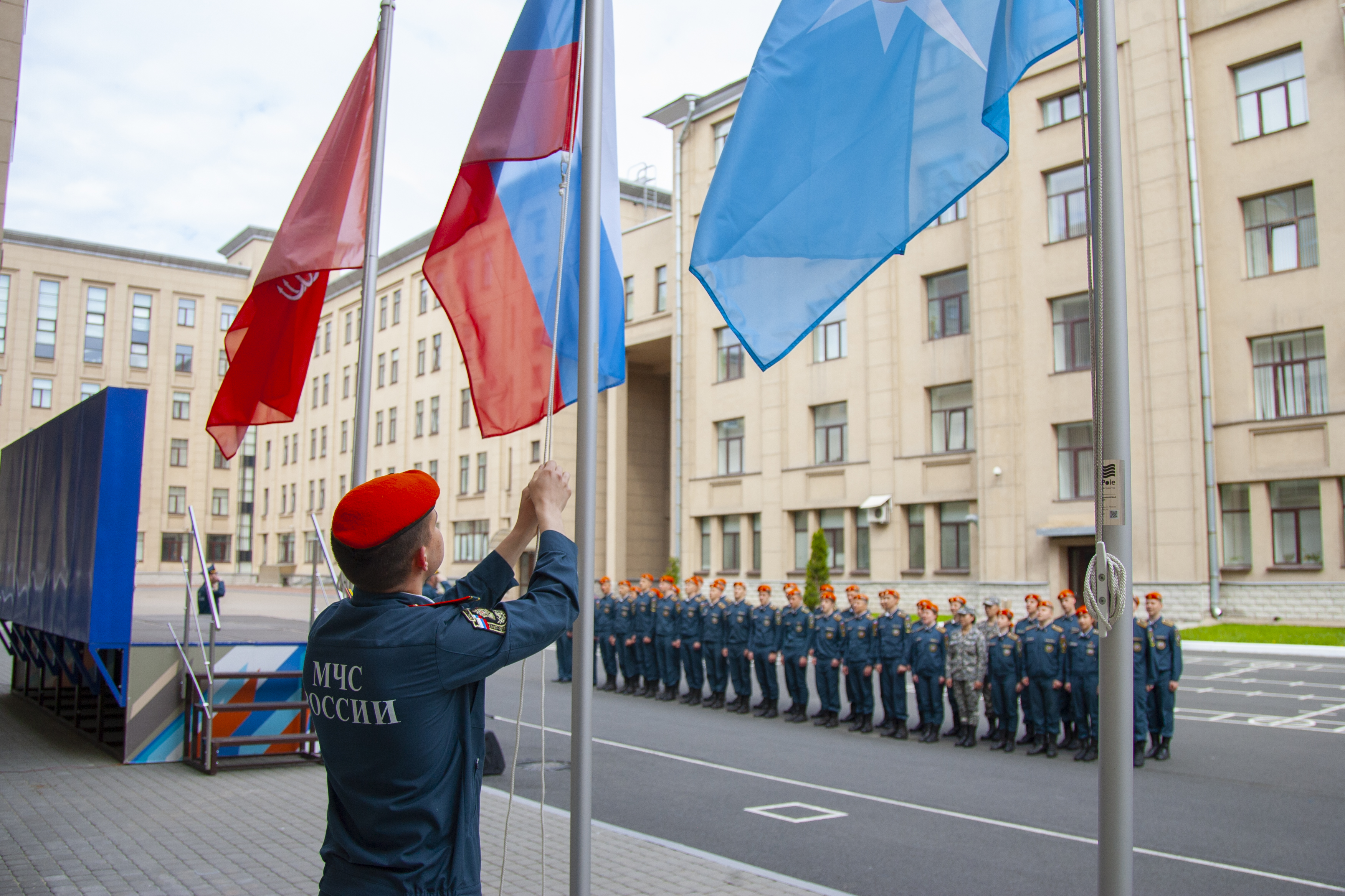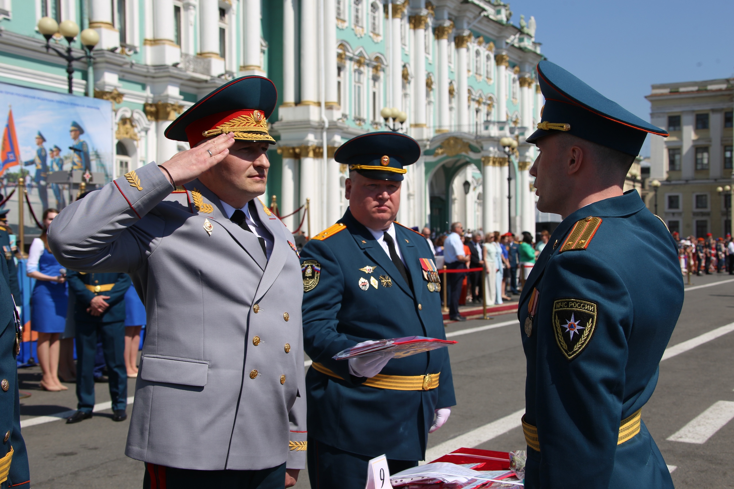 1 июля на Дворцовой площади глава спасательного ведомства Александр Куренков вручил дипломы и лейтенантские погоны выпускникам Санкт-Петербургского университета ГПС МЧС России