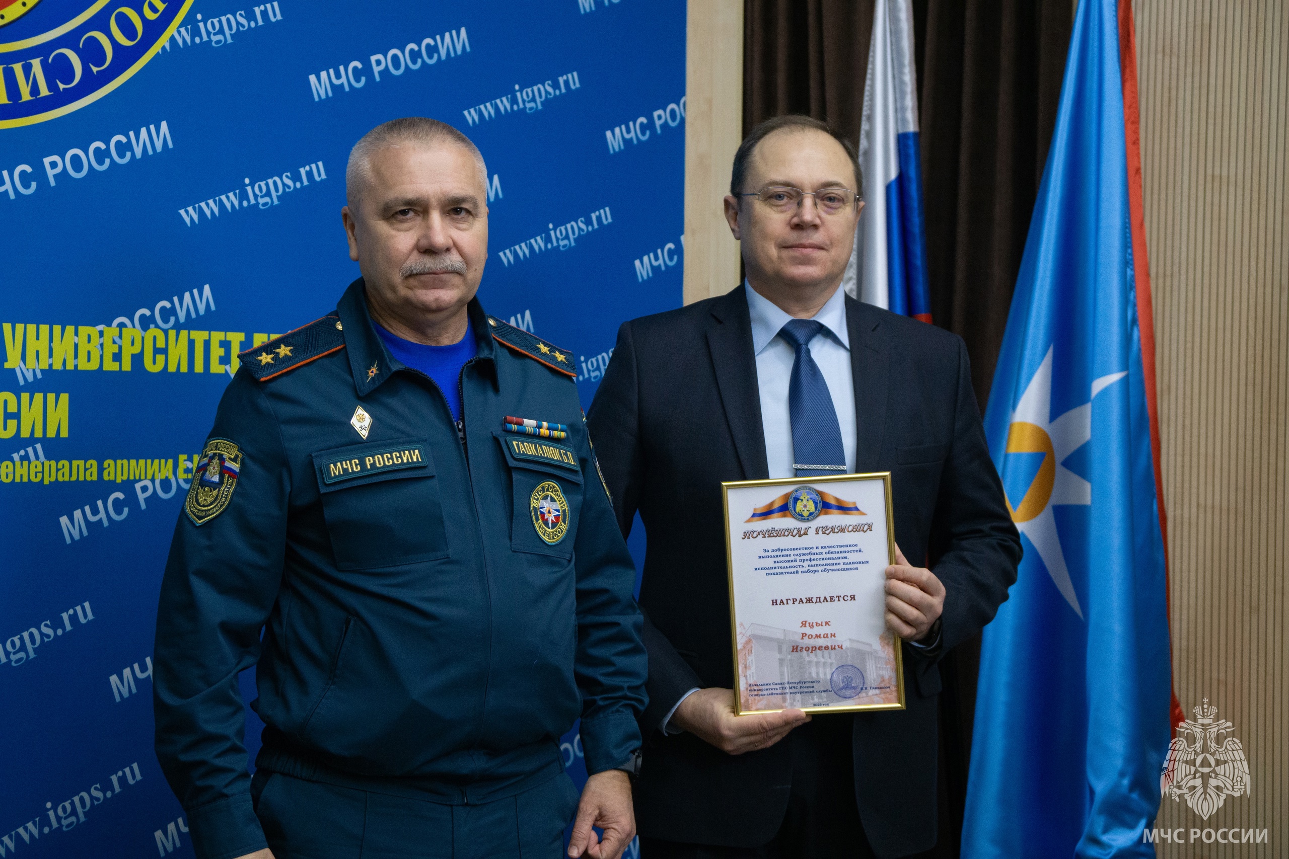 Поздравление начальника Санкт-Петербургского университета ГПС МЧС России Богдана Гавкалюка с 80-летием со дня начала работы испытательных пожарных лабораторий