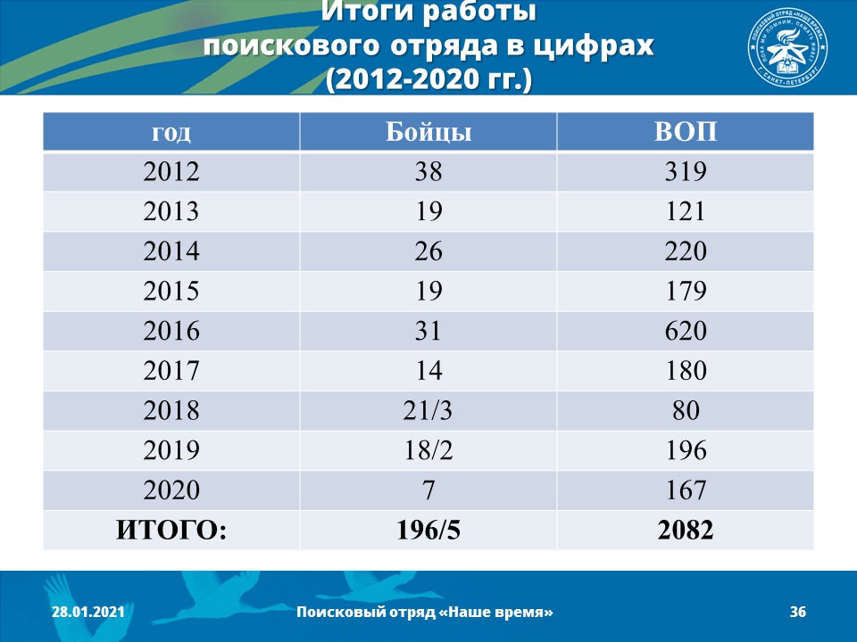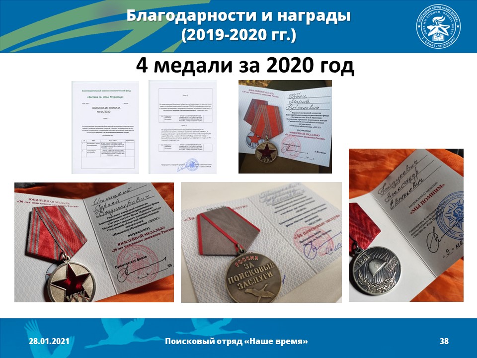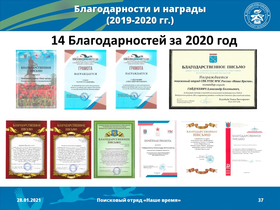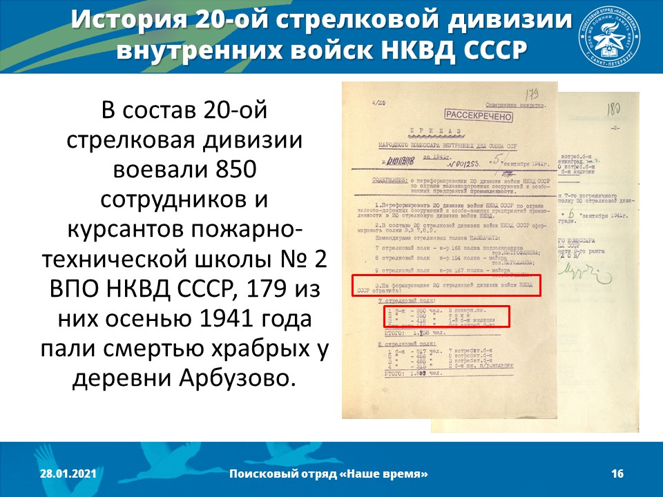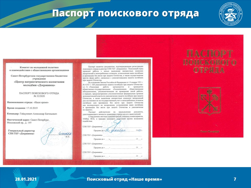17 октября 2019 год - Поисковый отряд «Наше время» зарегистрирован в реестре поисковых отрядов Центром патриотического воспитания молодежи "Дзержинец" (командир отряда - Гайдукевич Александр Евгеньевич). Получен официальный документ- паспорт поискового отряда.