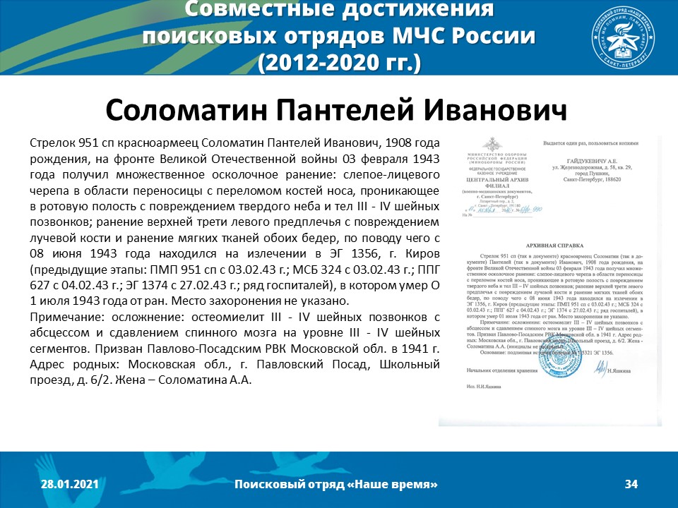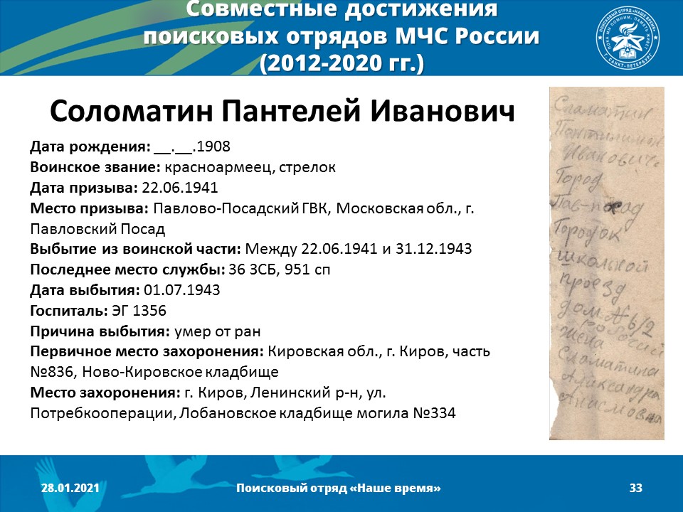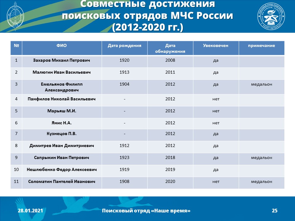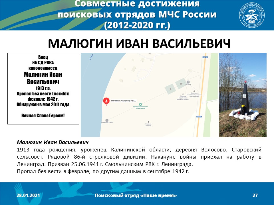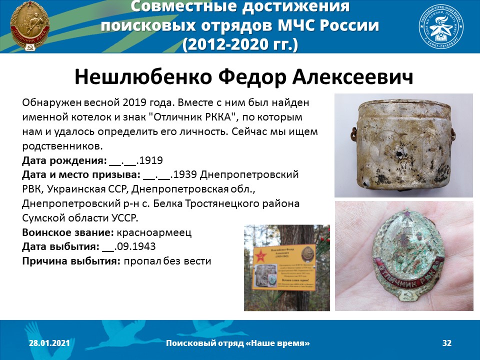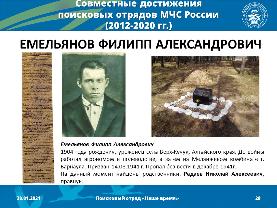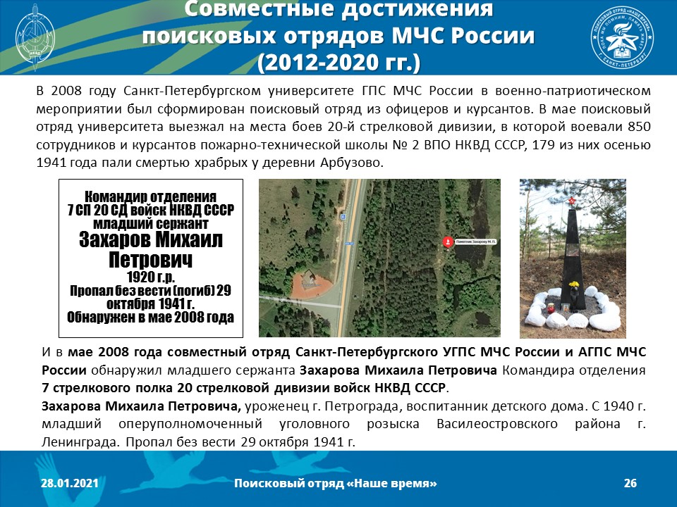 2012 год - Создано Молодежное поисково-музейное объединение «Наше время» (командир отряда - Песоцкий Александр Васильевич)