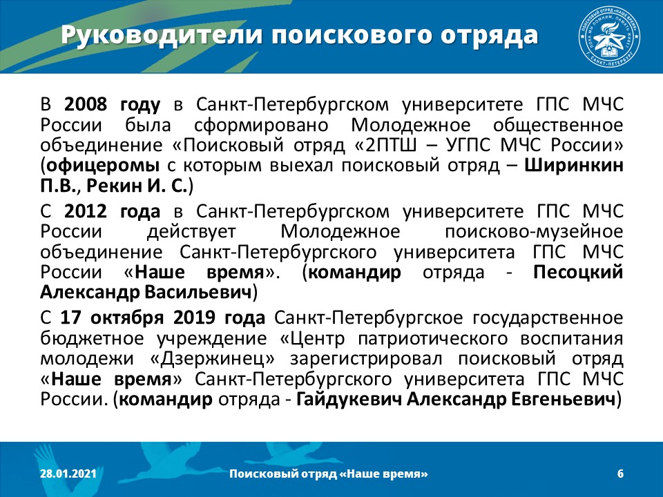 2008 год - в Санкт-Петербургском университете ГПС МЧС России сформировано Молодежное общественное объединение «Поисковый отряд «2ПТШ – УГПС МЧС России» (командир отряда – Рекин Илья Сергеевич)